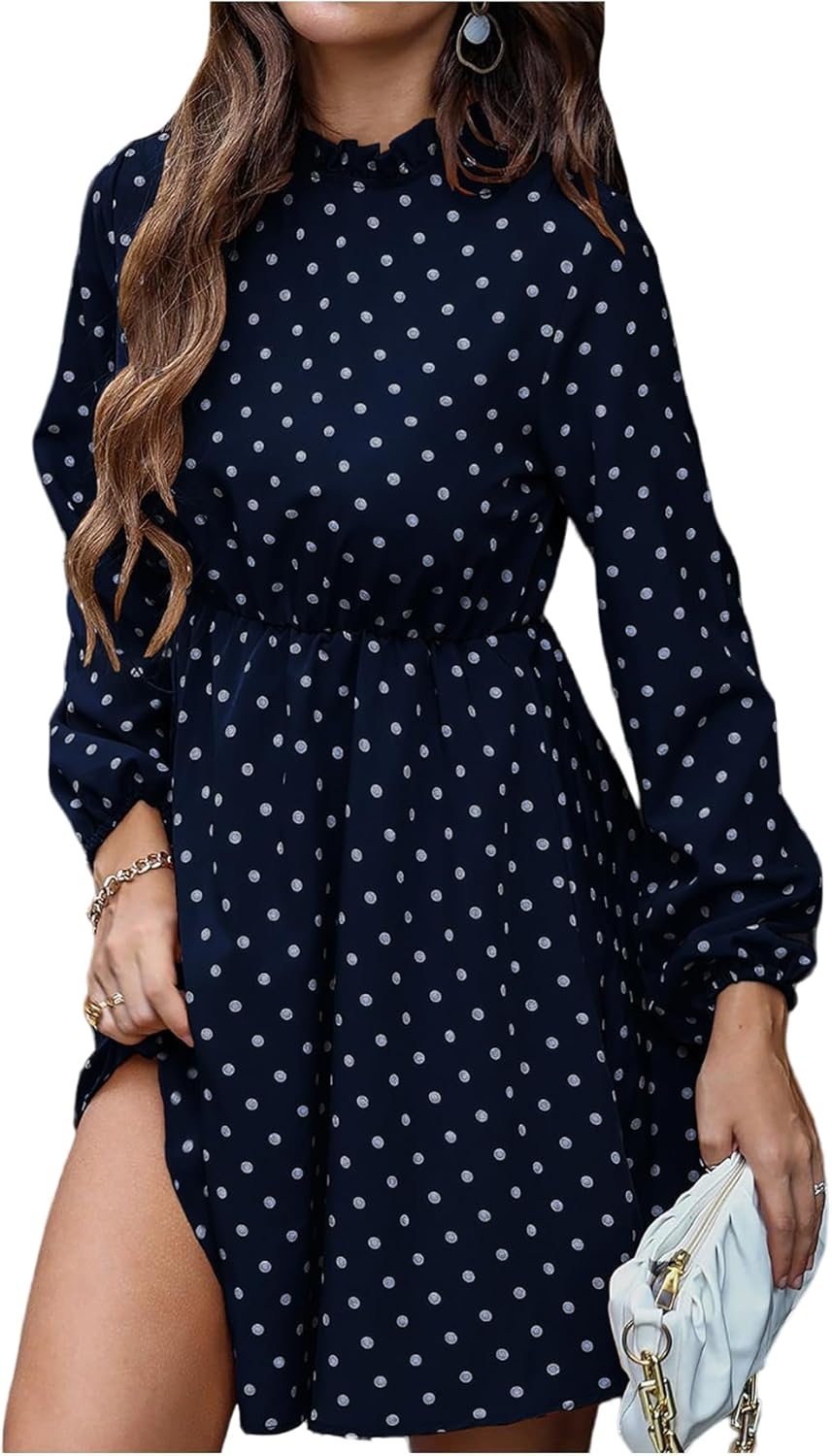 SweatyRocks Women's Polka Dots Mini Dress Vintage Mock Neck Long Sleeve A Line Short Dress