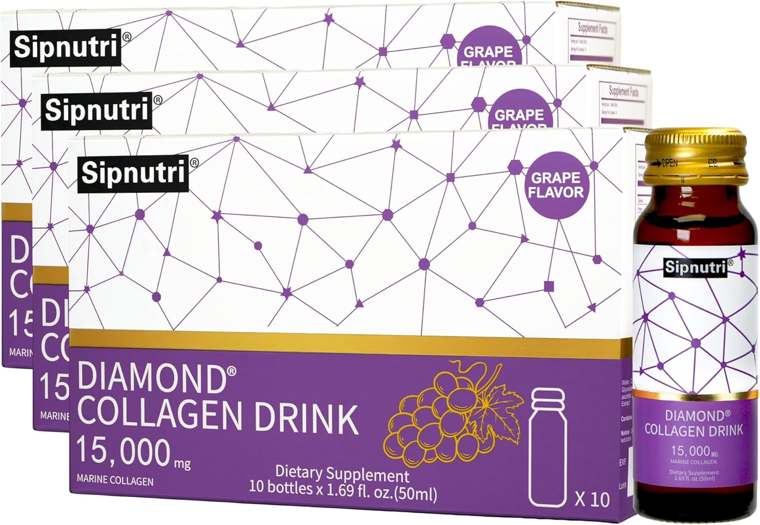 Diamond Collagen Drink -15,000mg Marine Collagen Peptides Liquid Shots for Women & Men, Hydrolyzed with Vitamin C & Pomegranate, Grape Flavor, Supports Skin, Hair & Nail Health-1.69 fl oz x30