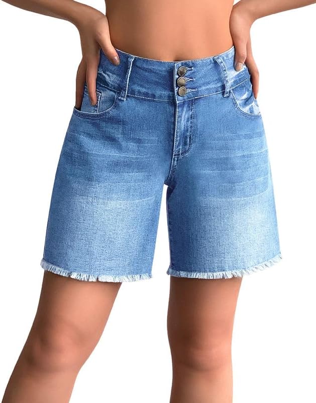 roswear Women's Stretchy Wide Leg High Waisted Frayed Hem Long Jean Shorts