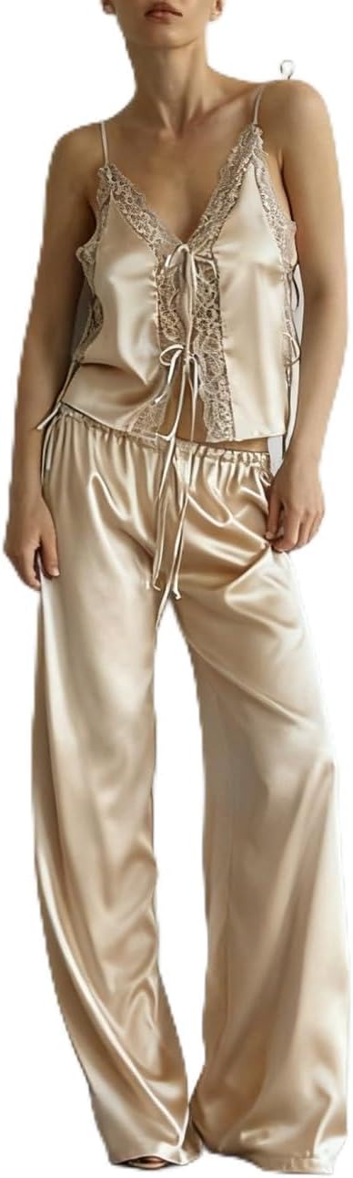 ROAONOCOMO Women Lace Trim Pajama Set Ruffle Babydoll Cami Top Wide Leg Pants Set Silk Satin 2 Piece PJ Lounge Outfit