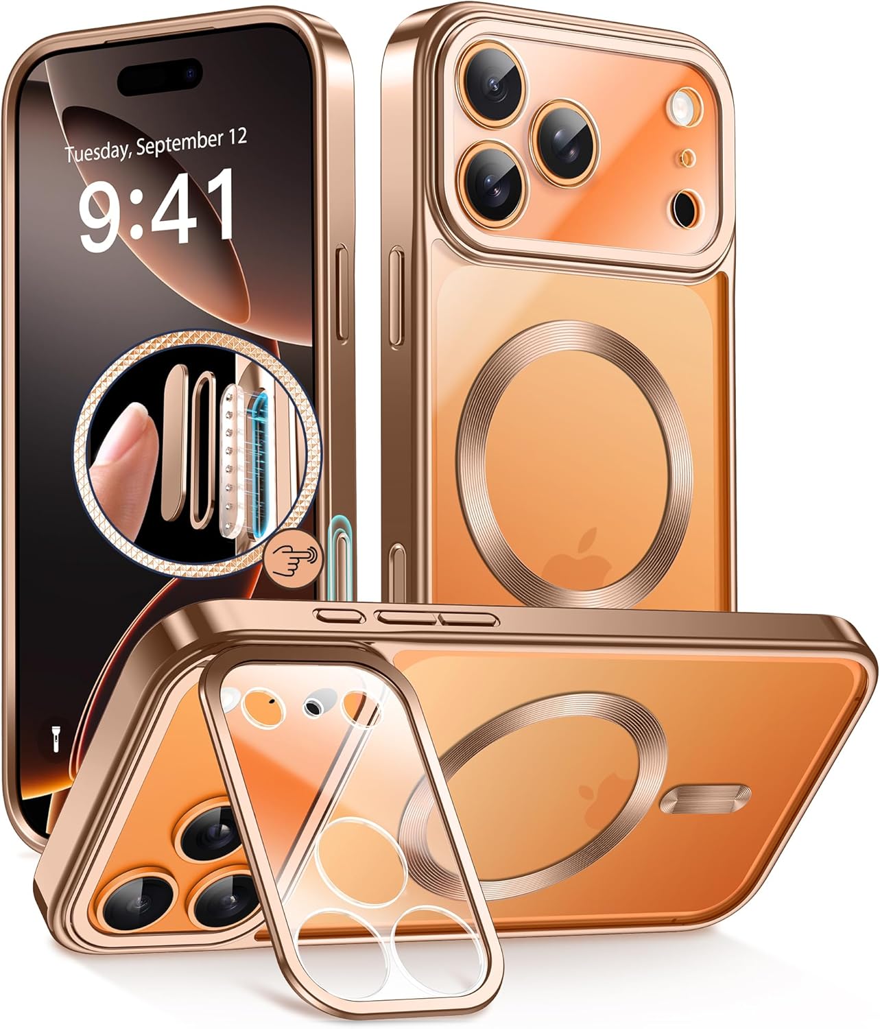 GolbinBox for iPhone 17 Pro Max Case with Stand, Compatible with MagSafe, Camera Control Button, Military-Grade Shockproof Protection, Plating Edge Phone Cover for 17 Pro Max 6.9'', Rose Gold/Clear