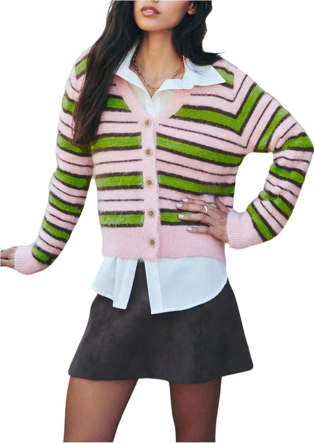 MakeMeChic Women's Striped Fuzzy Cardigan Sweaters Button Down Long Sleeve Outerwear