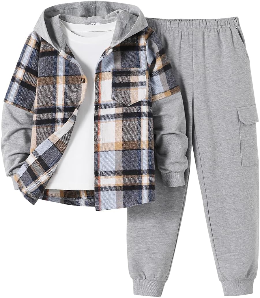 2Pcs Boys Clothes Sweatsuit Set Hoodie Flannel Plaid Shirt and Jogger Pants for Kids Fall Winter Spring Outfits
