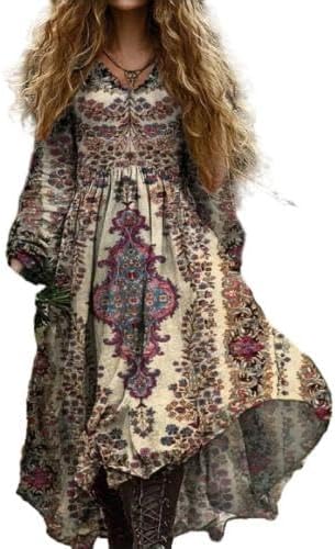 Women’s Boho Vintage Maxi Dress – Beige Tribal Floral Print Long Sleeve Loose Fit Dress for Casual Holiday Style