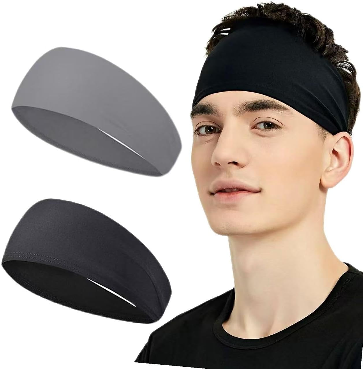 2Pcs Sports Headbands for Men & Women, Sweat Headband Non-Slip Sweatband Sports Running Cycling Yoga Basketball Workout Football Training (Black & Gray)
