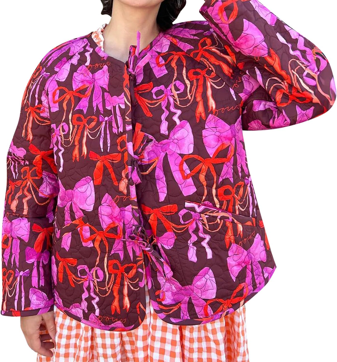 Quilted Jackets for Women Trendy Tie Front Bow Floral Print Cropped Puffer Jacket Reversible Coat