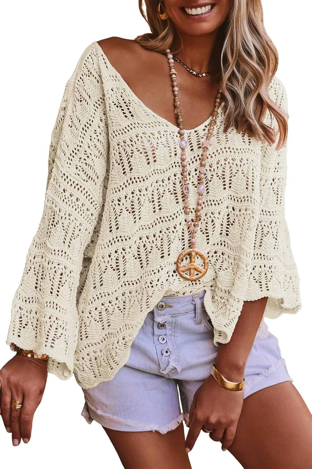 Allimy Womens Spring 3/4 Sleeves Crochet Oversized Sweater for Women 2026 Beach Resort Wear Tops