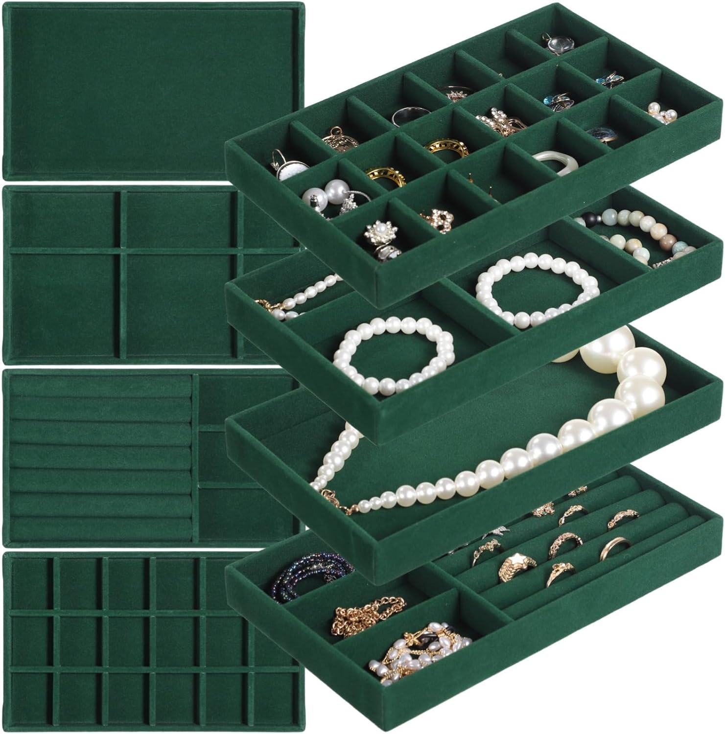 Homaisson Jewelry Organizer for Drawer, Velvet Jewelry Tray, Multiple Compartment Layout, Set of 4 Jewelry Organizer for Rings, Earrings, Bracelets, Necklaces (Green)