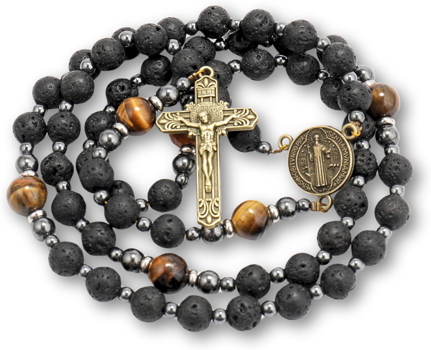 Lava Stone Black Rosary Beads for Men, Catholic Rosary Necklace with Saint Medal & Cross, Yellow Tiger Eye Beads Strong Rosary Cross Necklace in Portable Gift Box