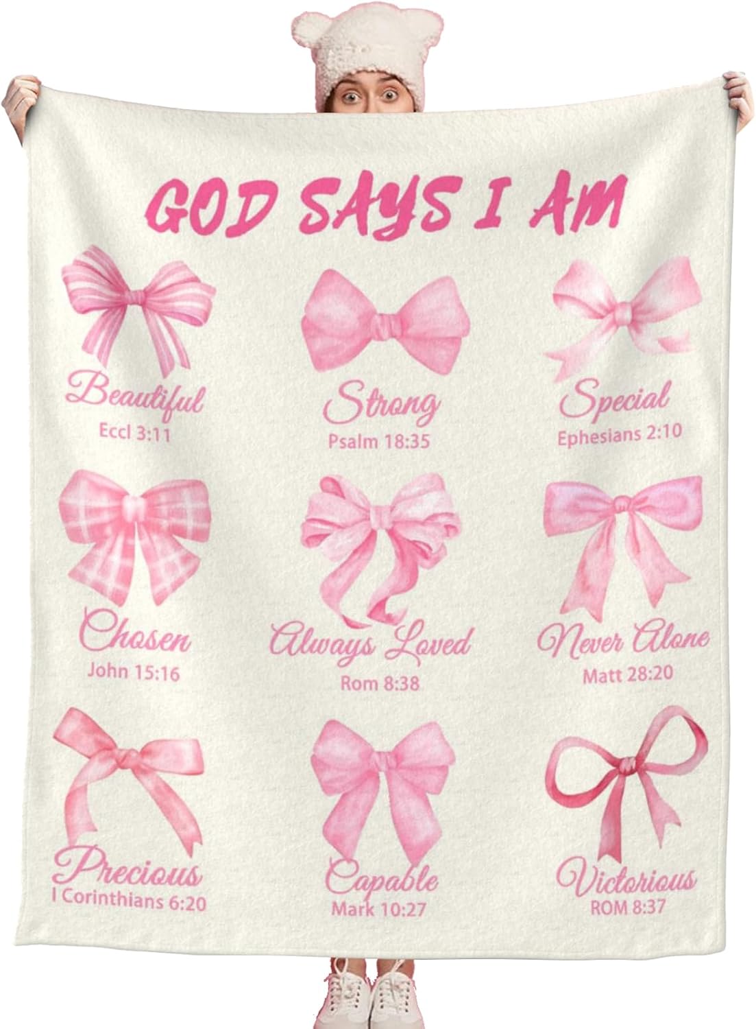 - Uplifting Biblical Affirmations. Features the powerful message "God Says I AM" followed by positive identity truths. This pink bow blanket offers daily encouragement and wrap you in coquette biblical promises. This is a heartfelt gift for women, mothers, daughters, sisters, dear friends, and loved ones—a reminder of their unique value in God's eyes and a source of comfort in difficult times.
