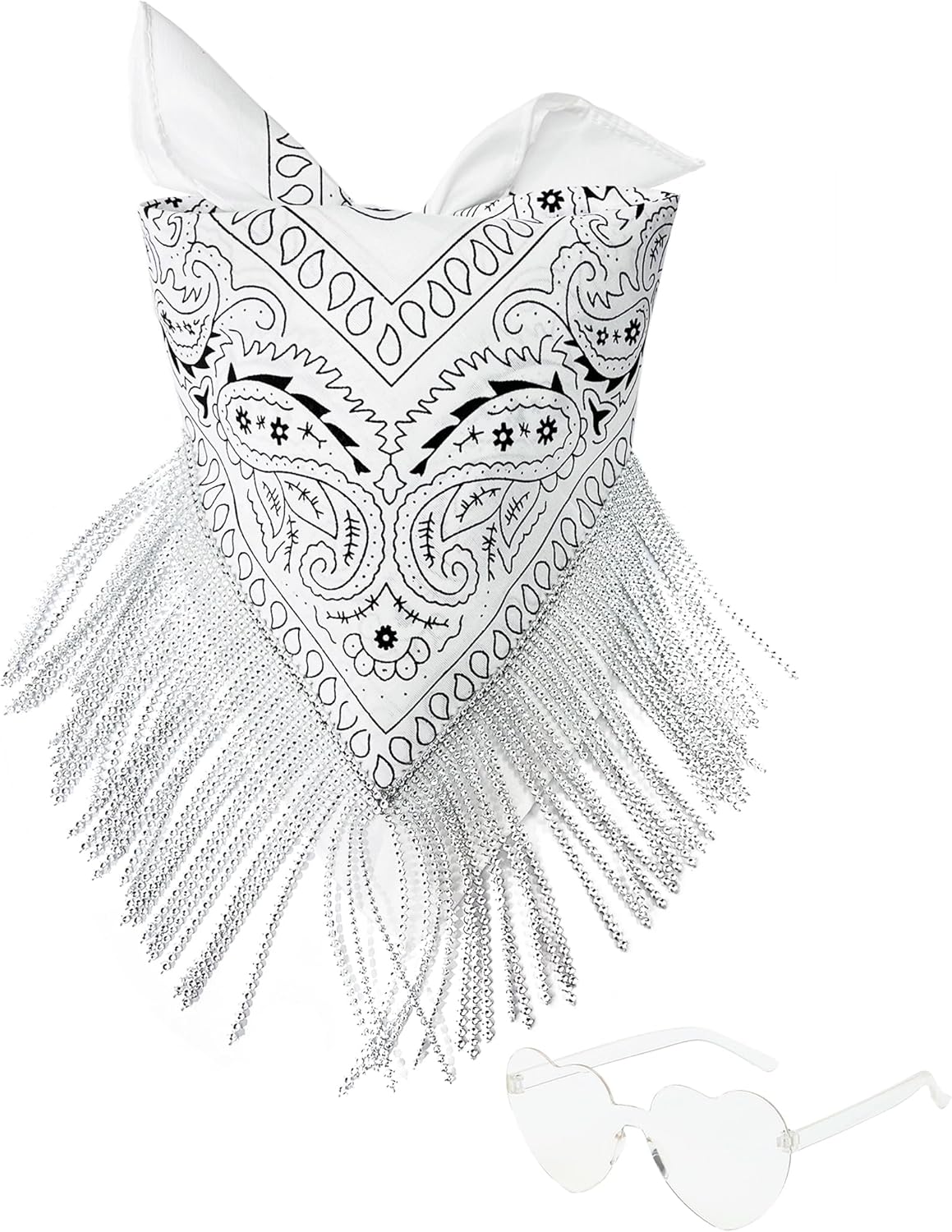 Fringe Rhinestone Bandana with Heart Sunglasses, Disco Cowgirl Boy Paisley Pattern Face Mask Square Scarf Headwear