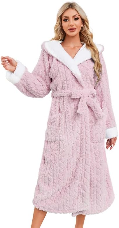 LYCY Womens Plush Hooded Robe, Soft Fluffy Womens Fleece Robe Long Warm Bathrobes for Women