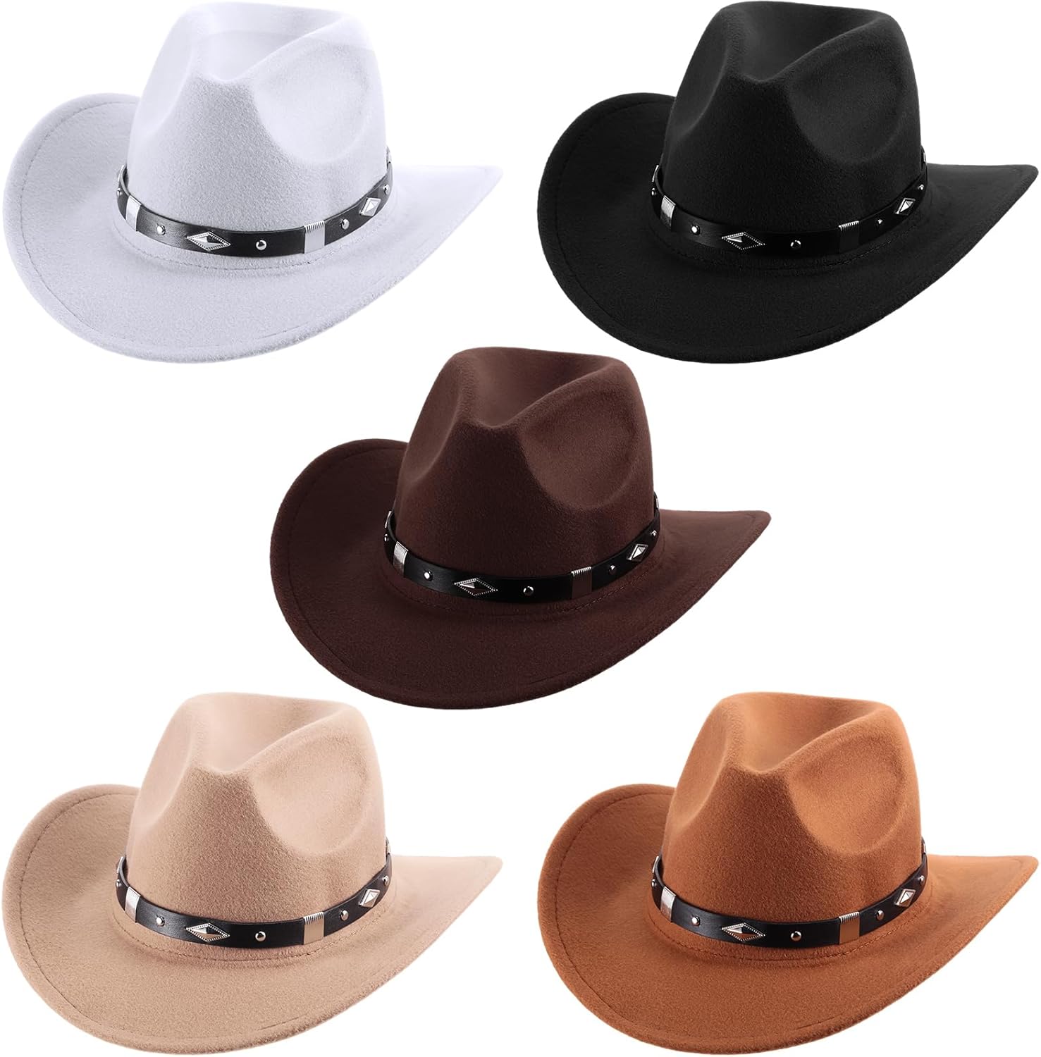 Toulite 5 Pcs Western Cowboy Hats with Buckle Belt Women Men Felt Wide Brim Cowgirl Hats Travel Caps Gift for Christmas
