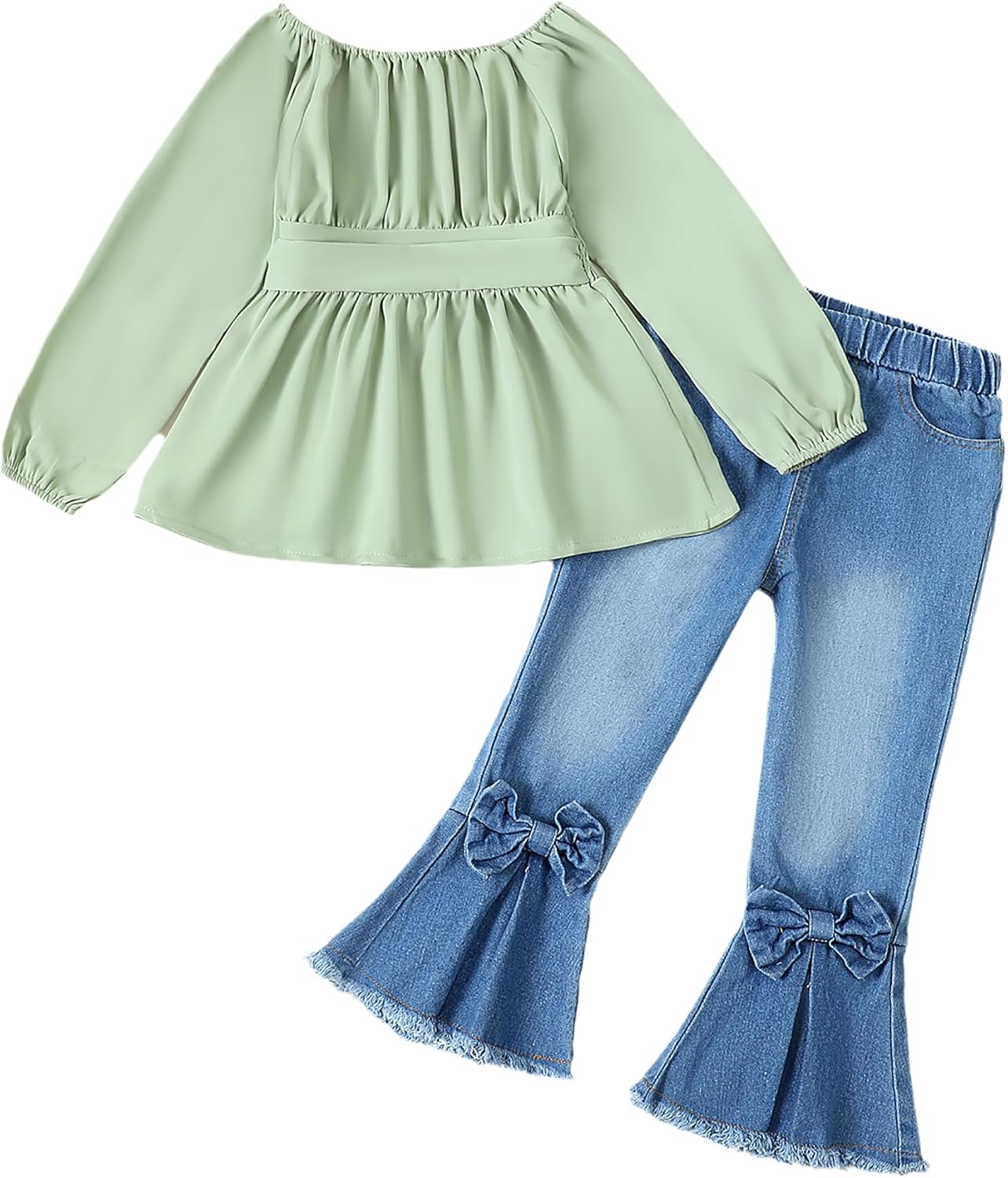 Kucnuzki Todder Baby Girl Clothes Long Sleeve Shirts Top Denim Bell Bottom Jeans 2 Piece Fall Winter Girl Outfits Set