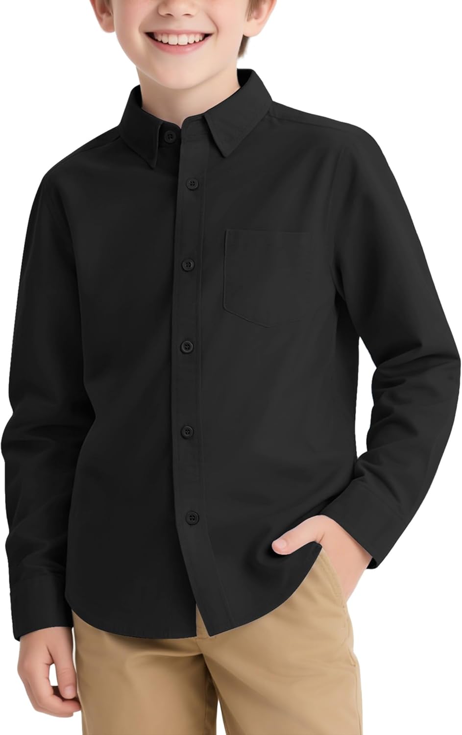 Boys Long Sleeve Dress Shirts Button Down Uniform Shirts with Chest Pocket Size 7-14 Years
