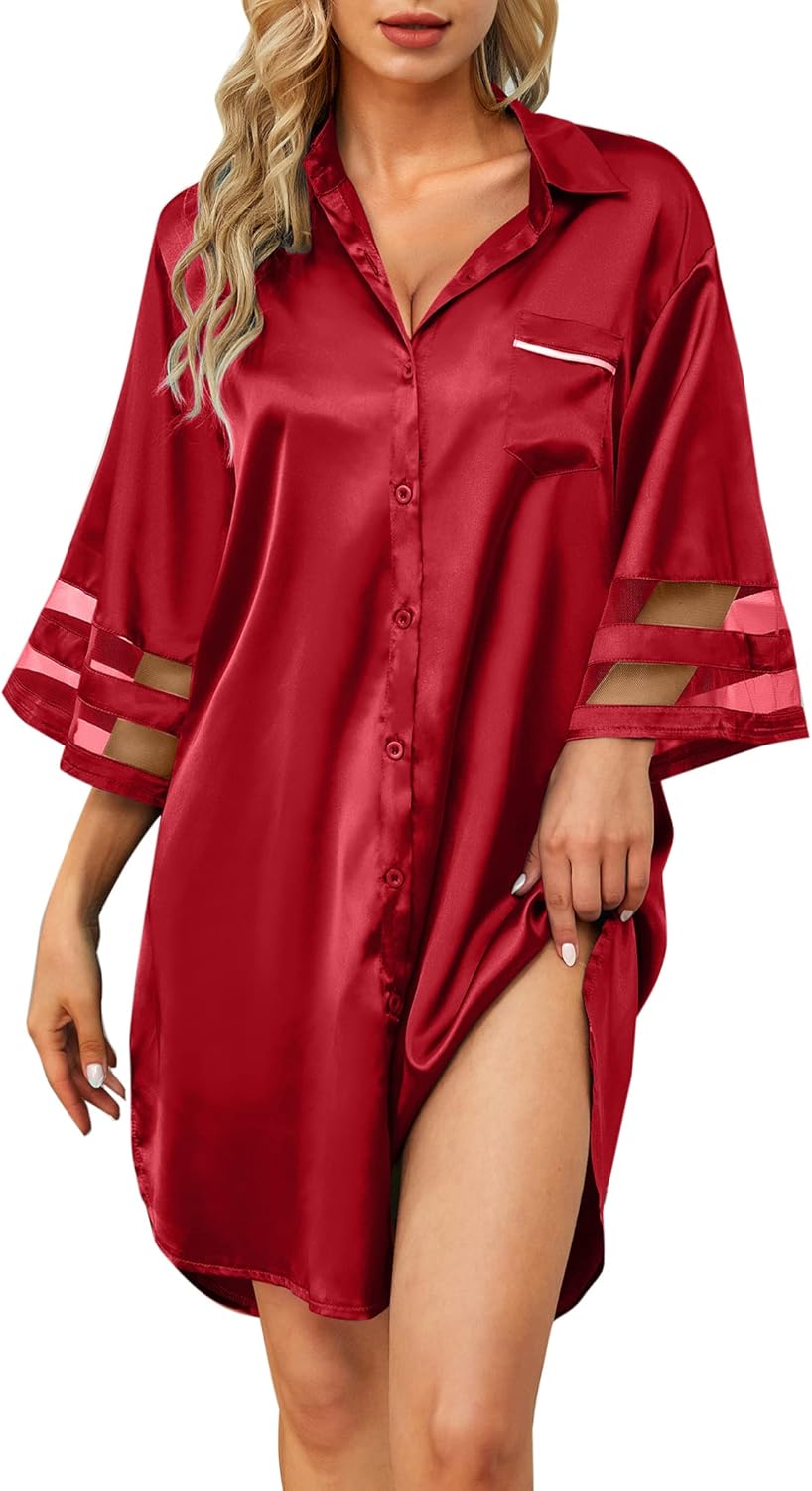 Women's Satin Nightgown Button Down 3/4 Sleeve Sleepwear Silk Night Gowns Nightshirt with Pocket