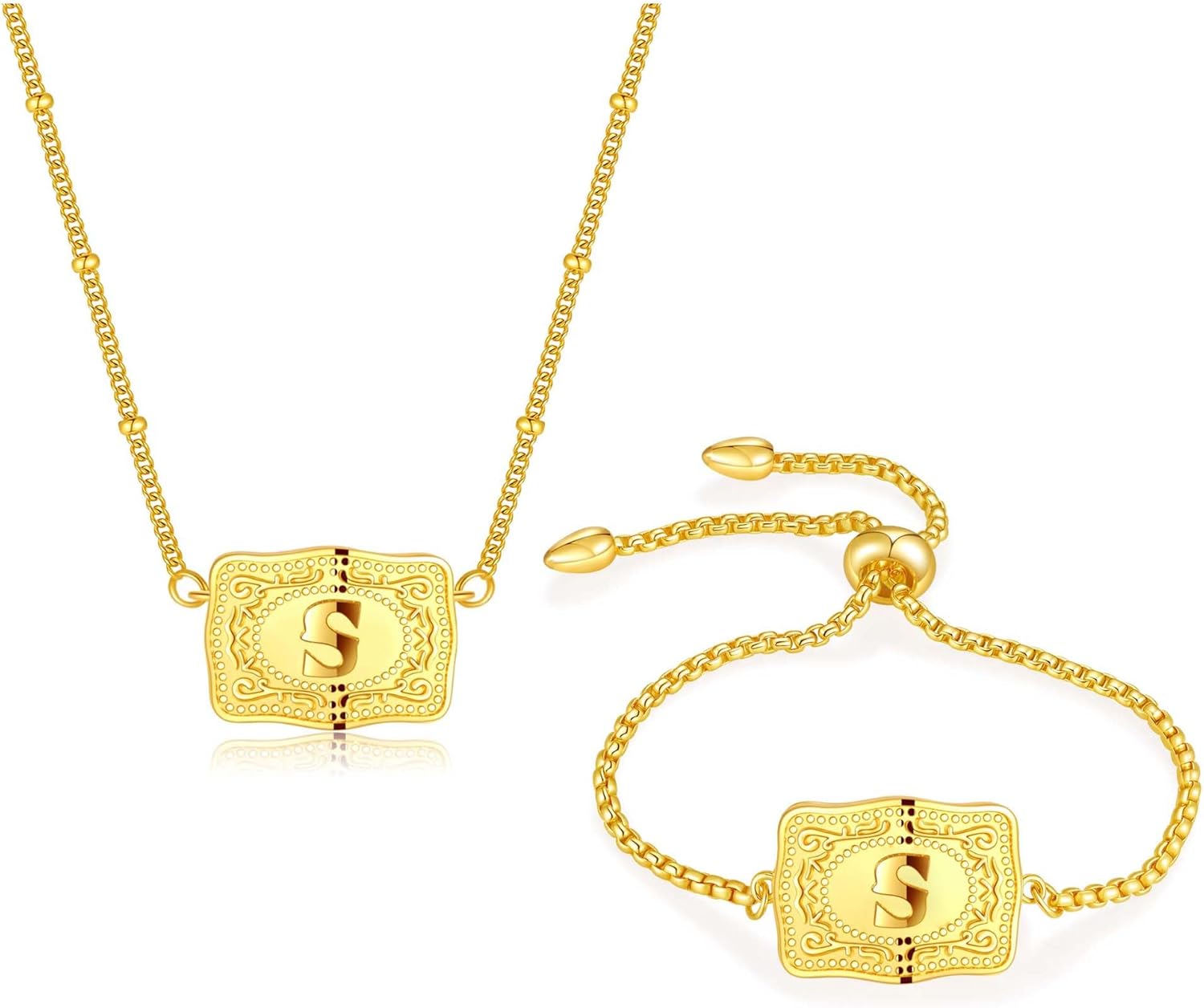 2 Pcs Belt Buckle Initial Necklace Bracelet Jewelry Set for Women, 18K Gold/Silver Plated Belt Buckle Initial A-Z Necklace Bracelet Set Unique Western Style Jewelry Gifts
