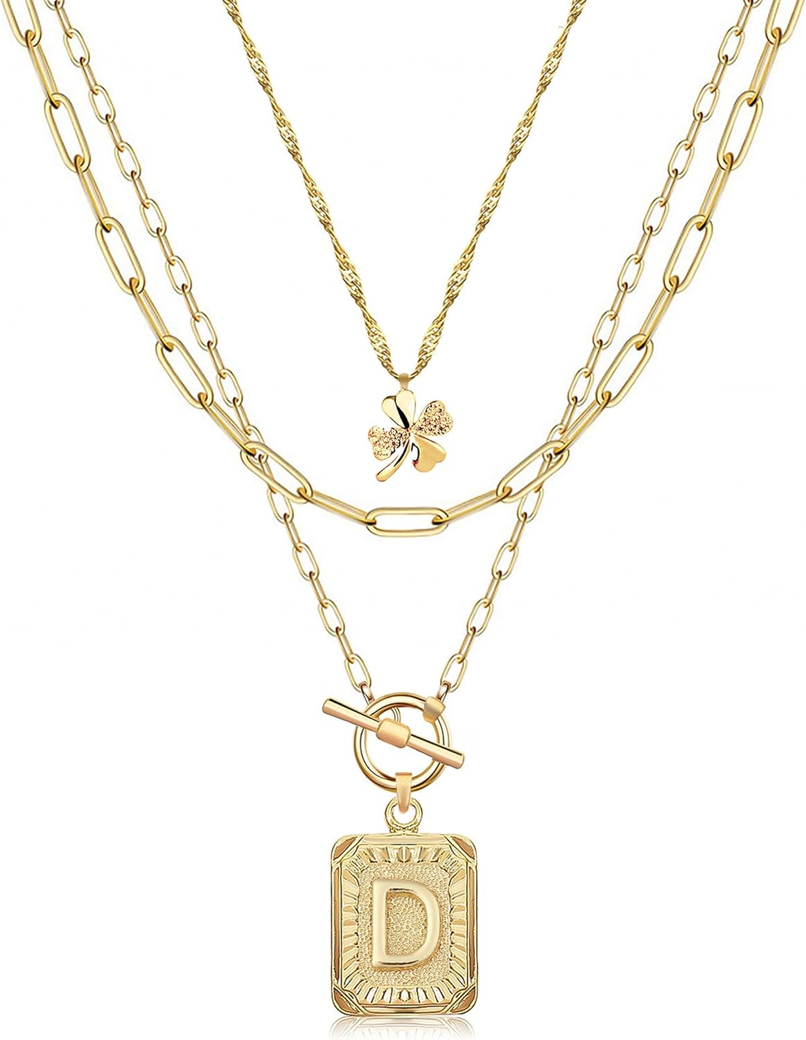 MJartoria Layered Clover Necklaces for Women Trendy, 14K Gold Plated Simple Initial Necklace Square Letter Pendant, Paperclip Chain, Gold Necklace Jewelry Gifts