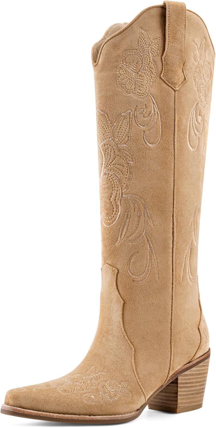 Cowboy Boots for Women Knee High Cowgirl Western Boots Pointed Toe Chunky Block Heel Retro Vintage Floral Embroidered Pull-On Tabs Tall Boot
