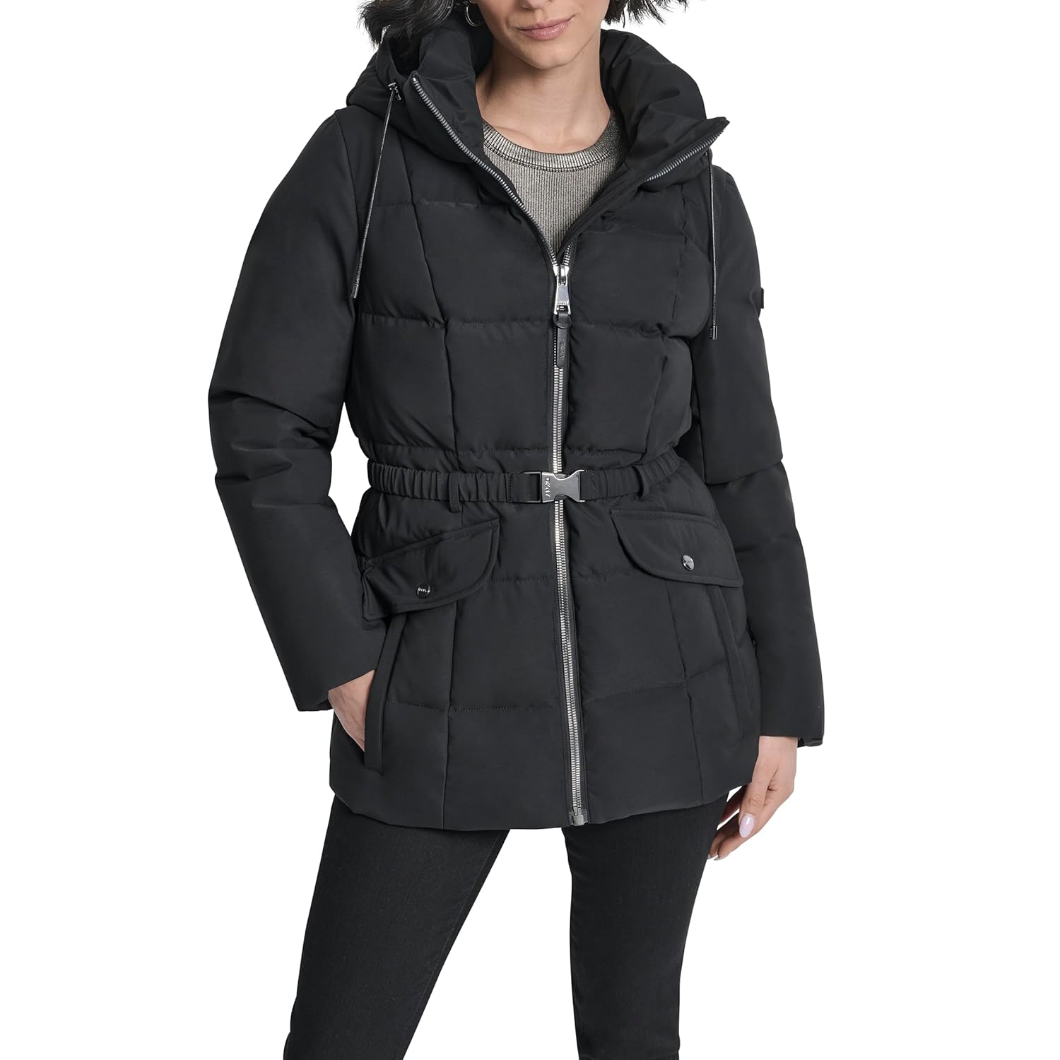DKNY womens Short Hooded Puffer Jacket With Belt – Quilted Waist-defining Winter Coat