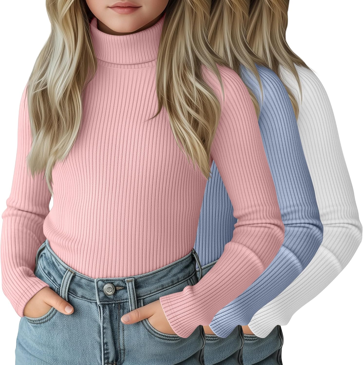 3 Pack Girls Turtleneck Long Sleeve Shirts Ribbed Knit Cotton Layer Tops Slim Fit Casual Undershirts 5-14 Years
