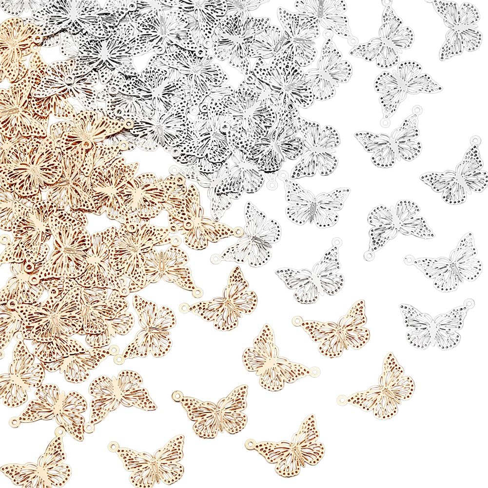 UNICRAFTALE about 100Pcs 2 Colros Butterfly Pendants Hollow Animal Charms Metal 10.5mm Dangle Charms Vintage Hang Ornaments for Jewelry Making Bracelet Choker Necklace Earring