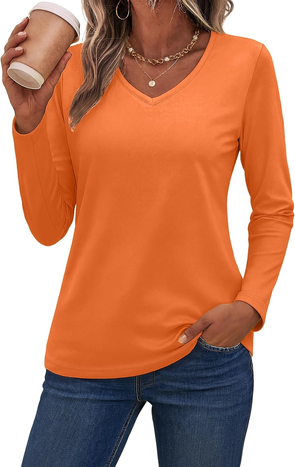 SMENG Womens Long Sleeve Shirts Pure Cotton V Neck T Shirt Basic Tops Casual Soft Tees