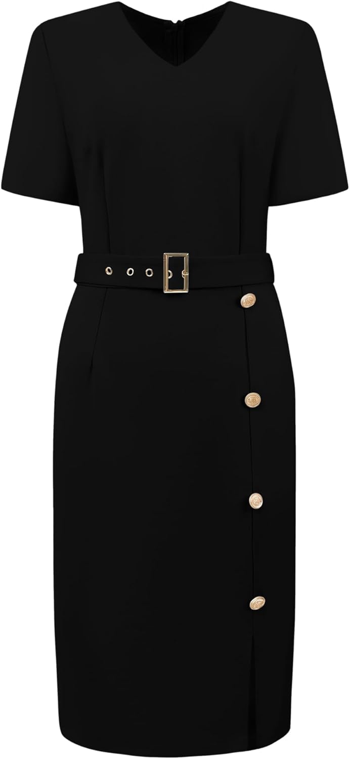 Women's Button Decor Sheath Dress Short Sleeve Pencil Dress with Belted