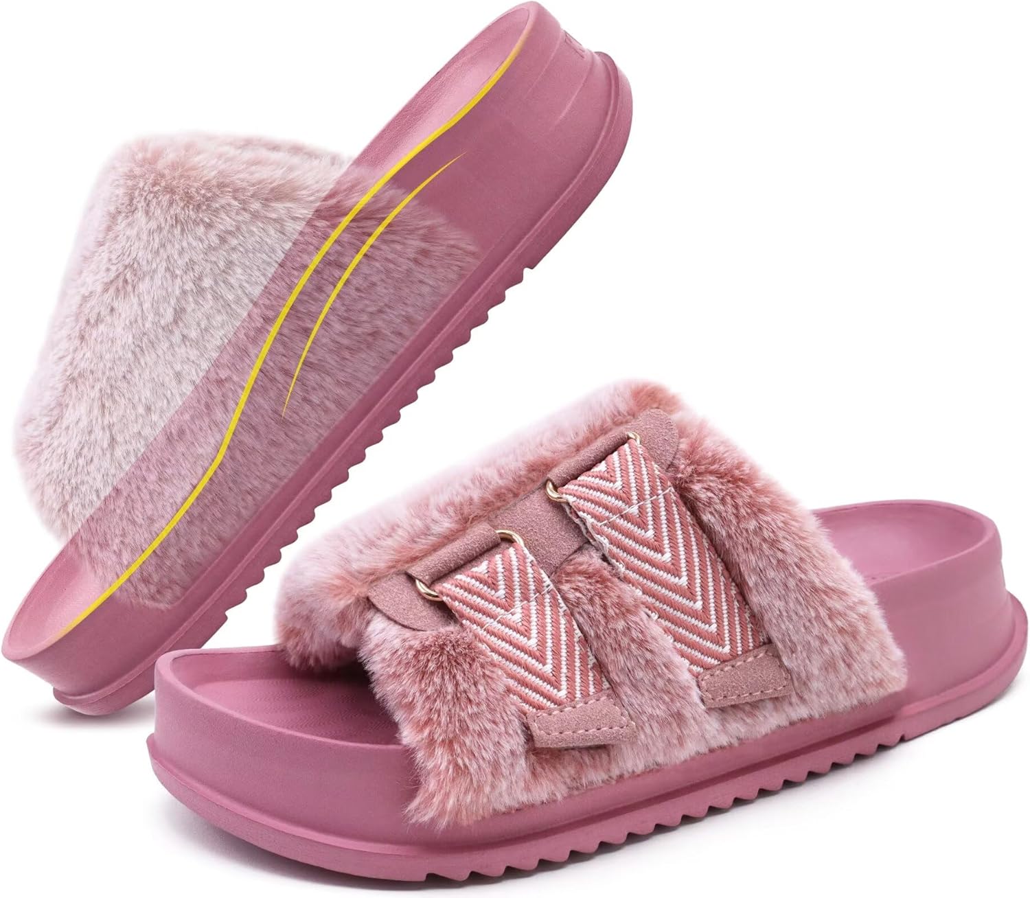 KuaiLu Womens Orthotic Sandals Comfortable Plantar Fasciitis Arch Support Faux Fur Sandal Slippers For Woman Adjustable Cushion Slides Slip On Indoor Outdoor Memory Foam House Shoes, Pink Size 12