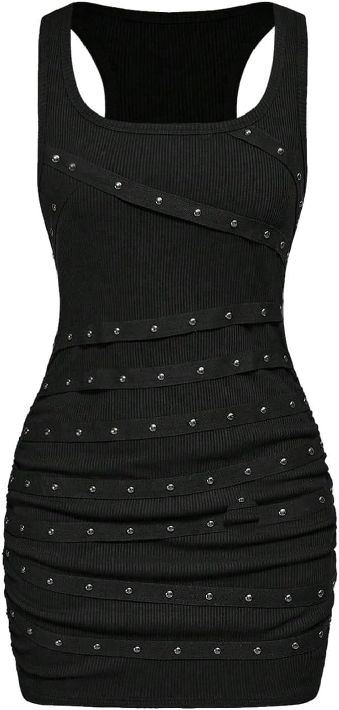 MakeMeChic Women's Summer Tank Mini Dress Y2K Square Neck Sleeveless Rivet Bodycon Short Dresses