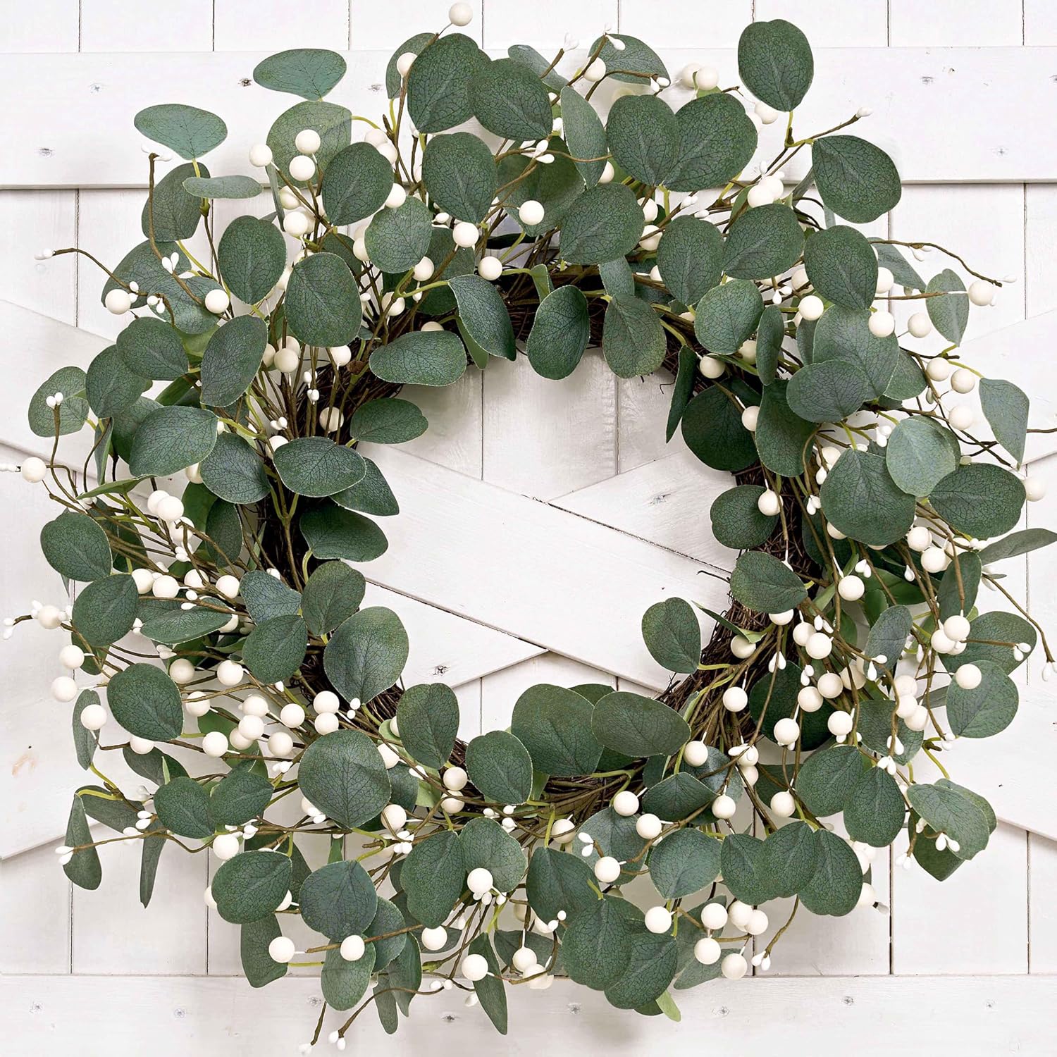 - Full and true: Bring winter charm with our lush green eucalyptus wreath! Decorated with full white berries and realistic eucalyptus leaves. Durable, natural-looking, and winter joy