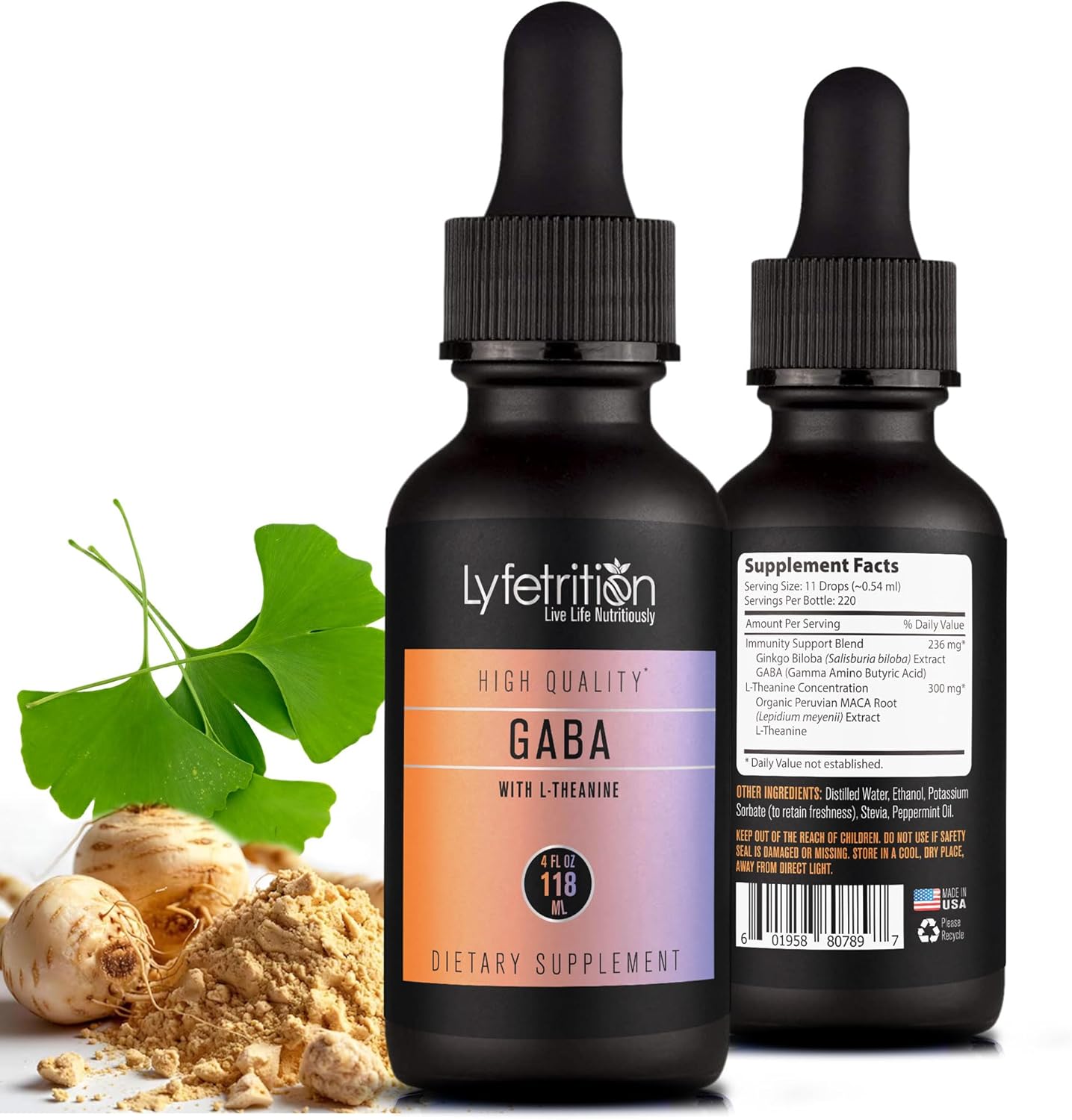 Lyfetrition GABA with L-Theanine, Ginkgo Biloba (Salisburia biloba) Extract, Organic Peruvian MACA Root (Lepidium meyenii) Extract, 118 ml, 4 FL Oz Liquid, 220 Servings, Made in USA, Quick Absorption