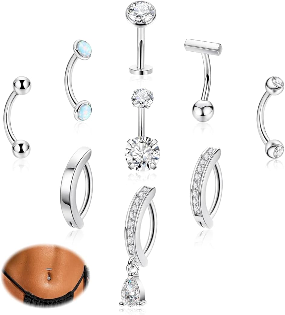 14G 9Pcs Surgical Steel Petite Belly Ring for Women Shiny CZ Clicker Belly Button Ring Hypoallergenic Curved Barbell Navel Ring Simple Floating Belly Piercing Jewelry Pack