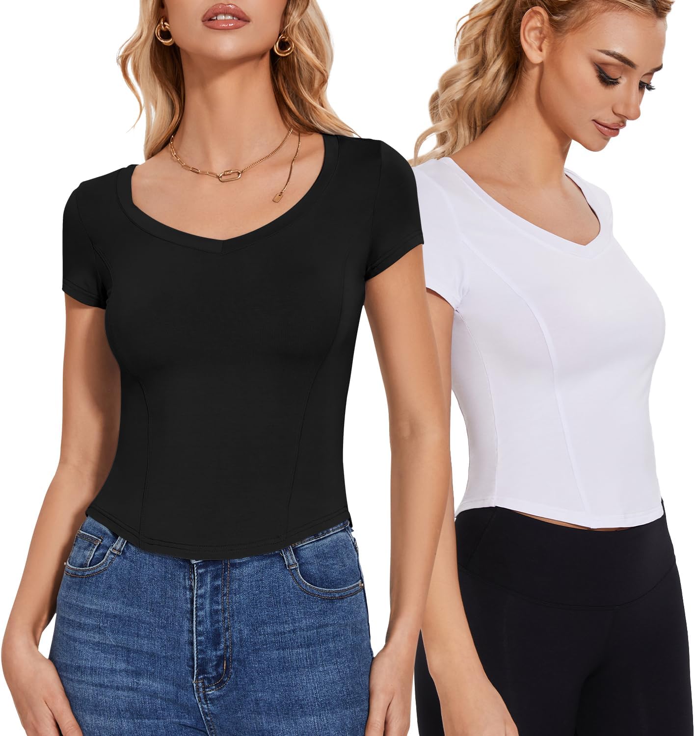 LUYAA Women's Deep V Neck Short Sleeve T Shirts Curved Hem Trendy Summer Going Out 1/2/3 Pack Tops XS-XL