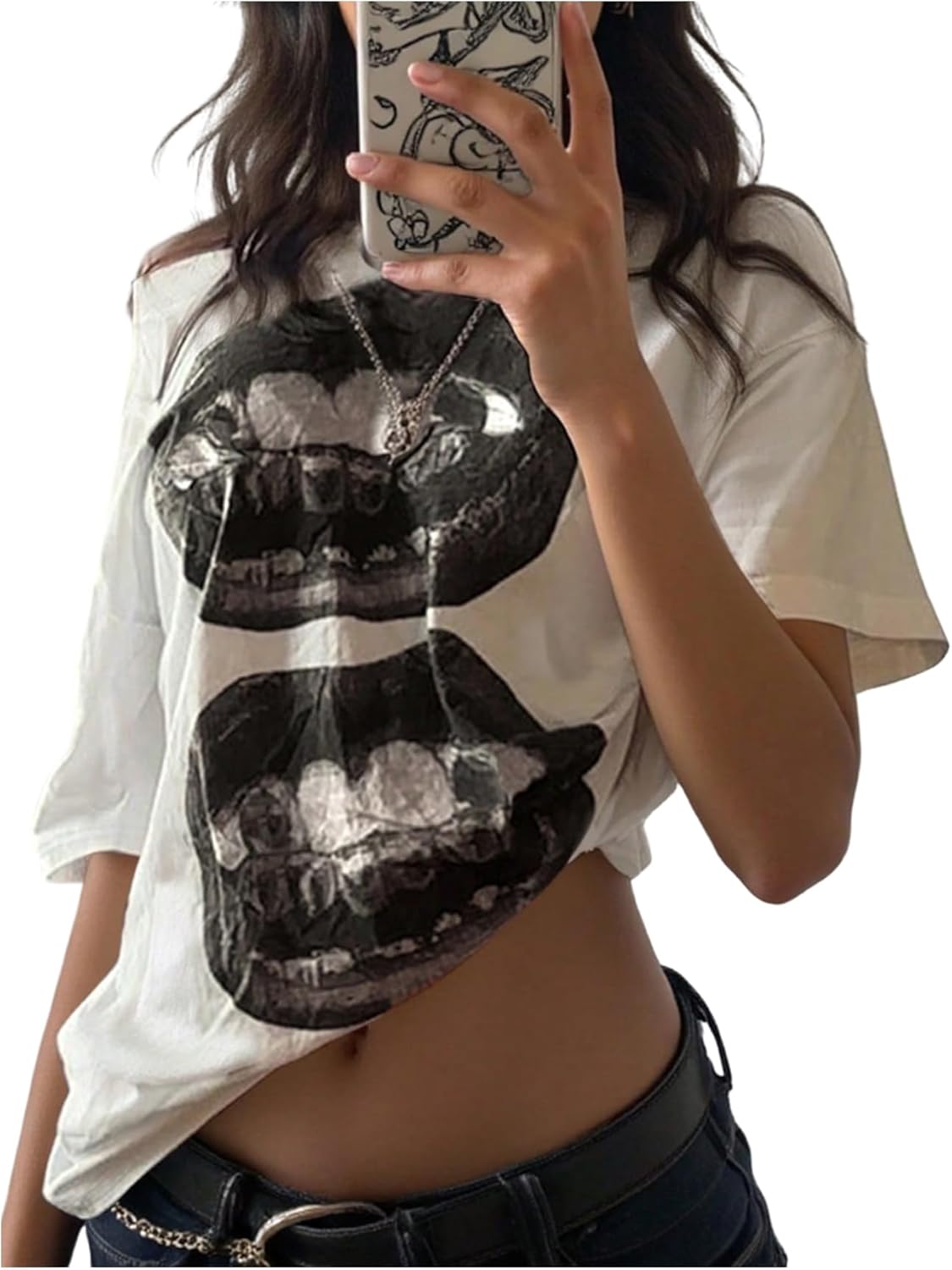Women's Off The Shoulder Tops Short Sleeve Lip Graphic Tees Retro Y2K Summer T Shirts