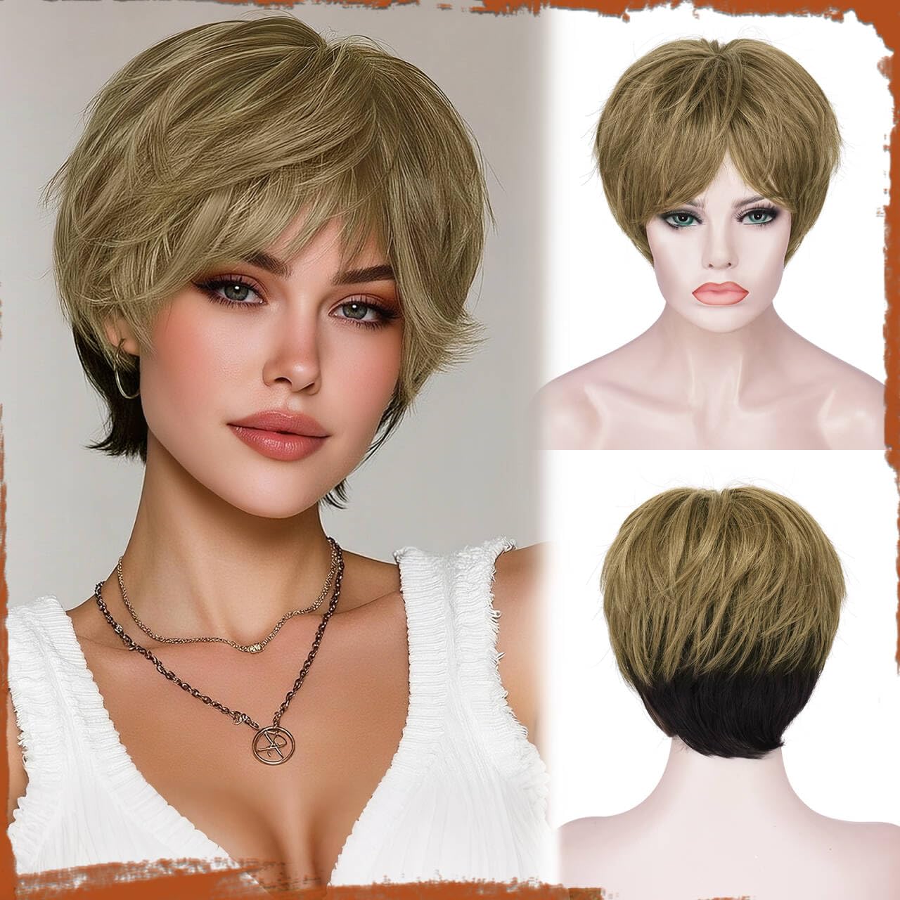 SOFEIYAN Pixie Cut Wig - Short Honey Blonde with Black Underlayer Pixie Haircut Wig with Bangs Pre-Styled Glueless Layered Synthetic Hair Wigs for Women Natural Looking Wigs for Daily Wear