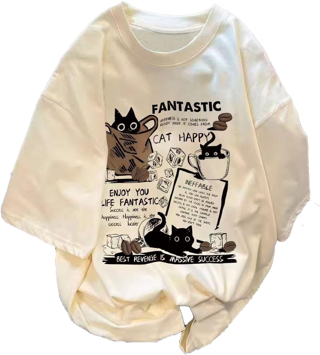 Unisex Y2K Cat Letter Print T-Shirt Harajuku Kawaii Casual Oversize T-Shirts Short Sleeves Cotton Tops