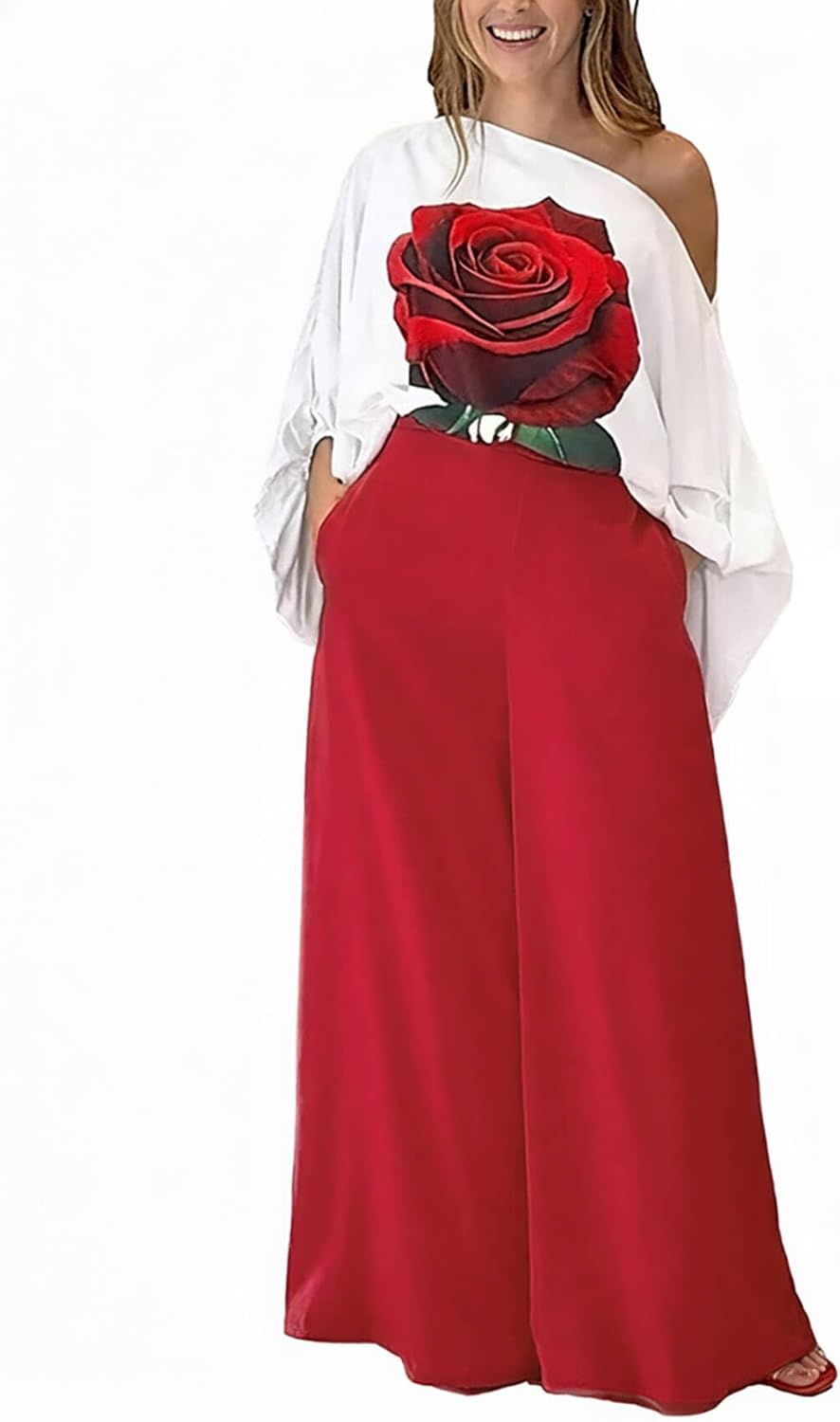 CHICME 2 Piece Sets for Women Off Shoulder Lantern Sleeve Top Flowy Rose Print Wide Leg Pants Set