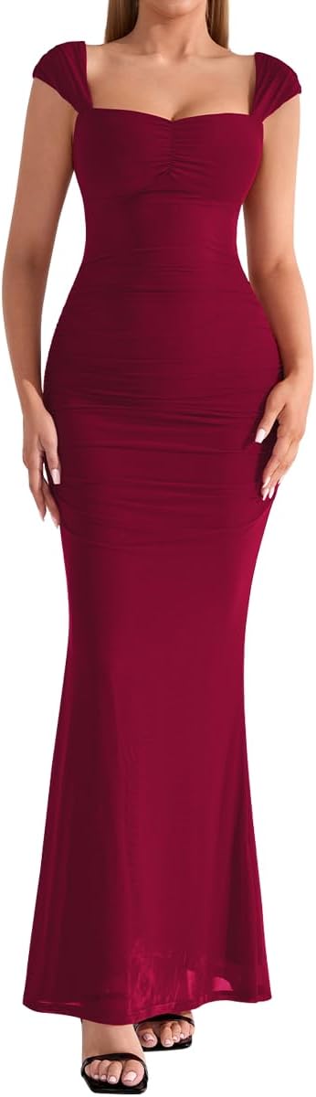 Cap Sleeve Long Formal Dress Elegant Lace Up Bodycon Ruched Maxi Cocktail Wedding Guest Dresses for Women