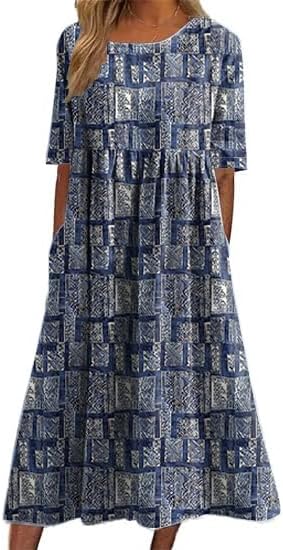 Womens Plus Size Boho Floral Printed Midi Dress Casual Loose Summer Short Sleeve Beach Dress with Pockets