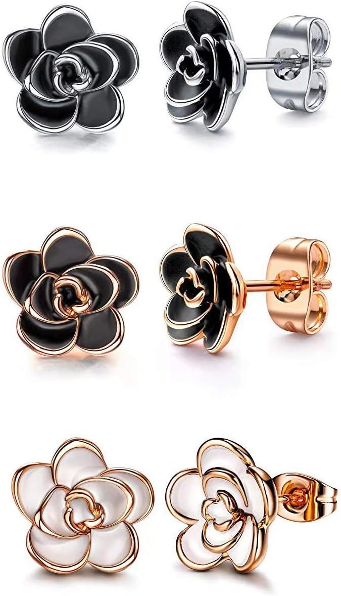 3 Pairs Gold Silver Black Fashion Rose Flower Stud Earrings for Women Valentine's Day
