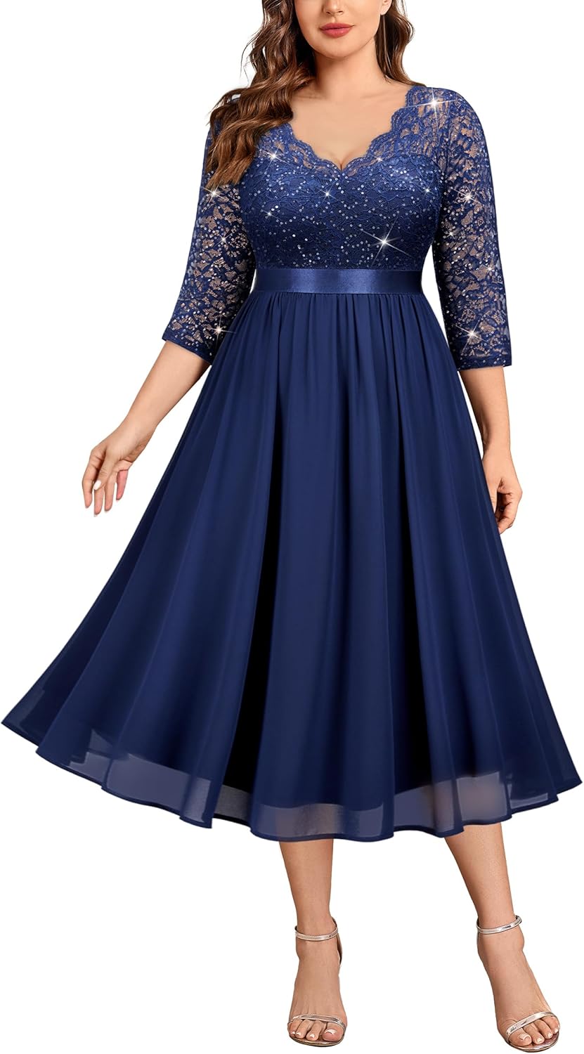 MISSMAY Women's Plus Size Sequins Lace Sleeves V-Neck Midi A-Line Cocktail Dresses