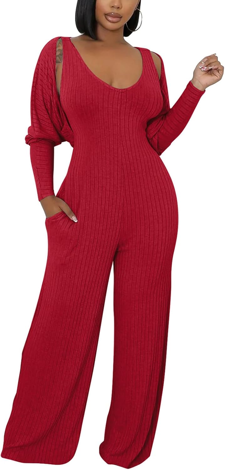 Annystore Sexy 2 Piece Set for Women Fall Outfit Ribbed Knit Long Sleeve Crop Cardigan Wide Leg Pants Set Jumpsuit Clubwear