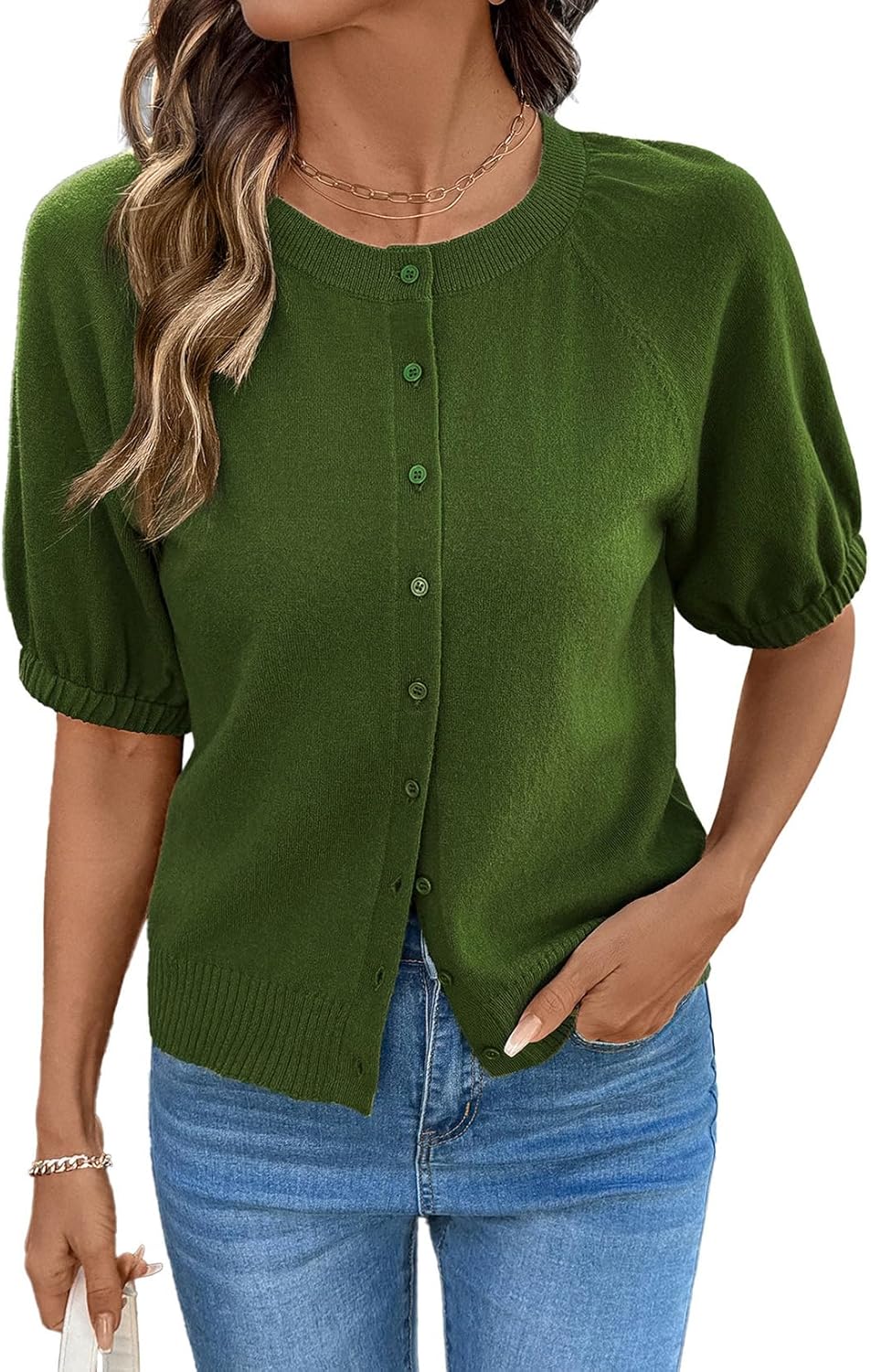Dokotoo Women's Summer Casual Puff Short Sleeve Cardigan Sweaters Lightweight Soft Crewneck Button Down Knit Sweater Tops