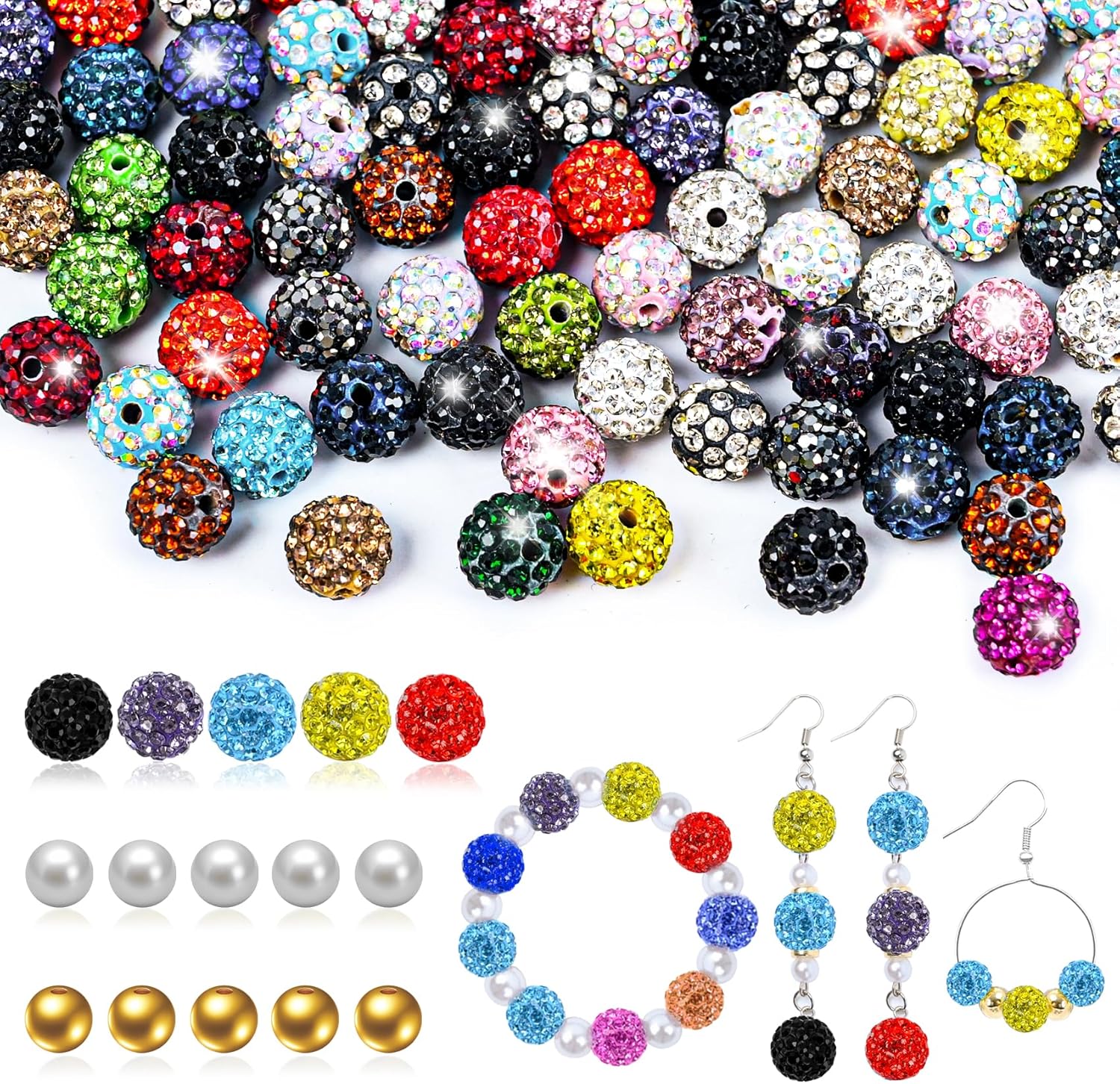 - 【Adequate Quantity & Versatile Crafting】:150pcs Round Shamballa Disco Ball Beads (10mm) + 25pcs 8mm Gold Beads+25pcs 8mm white beads+5pcs 6mm Gold Beads+ 5pcs 6mm white Beads+26pcs Other accessories. Bulk DIY Supplies for Jewelry Making, Craft Parties & Gifts