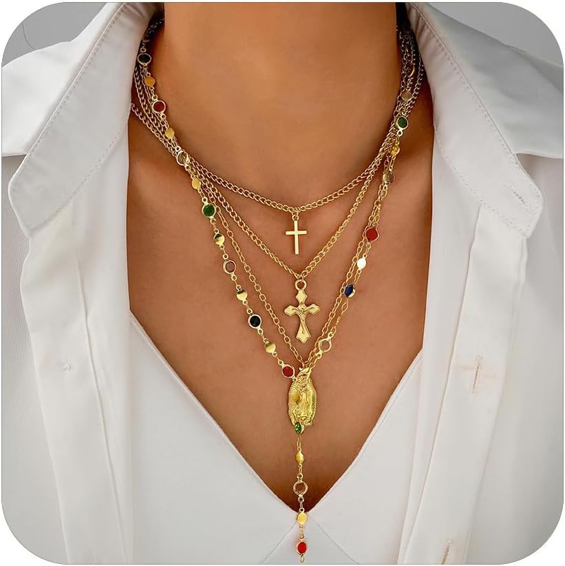Cross Pendant Necklace for Women Colorful Cubic Zirconia Cross Necklace Pendant Pearl Chain Cross Necklace Gothic Catholic Christian Costume Cross Jewelry