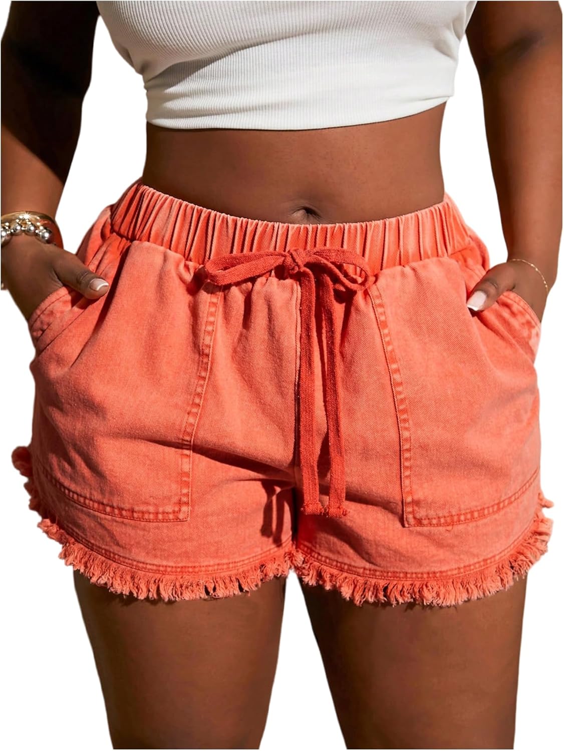 GORGLITTER Women's Plus Size Jean Shorts Frayed Raw Hem Drawstring Straight Leg Casual Summer Cute Denim Shorts