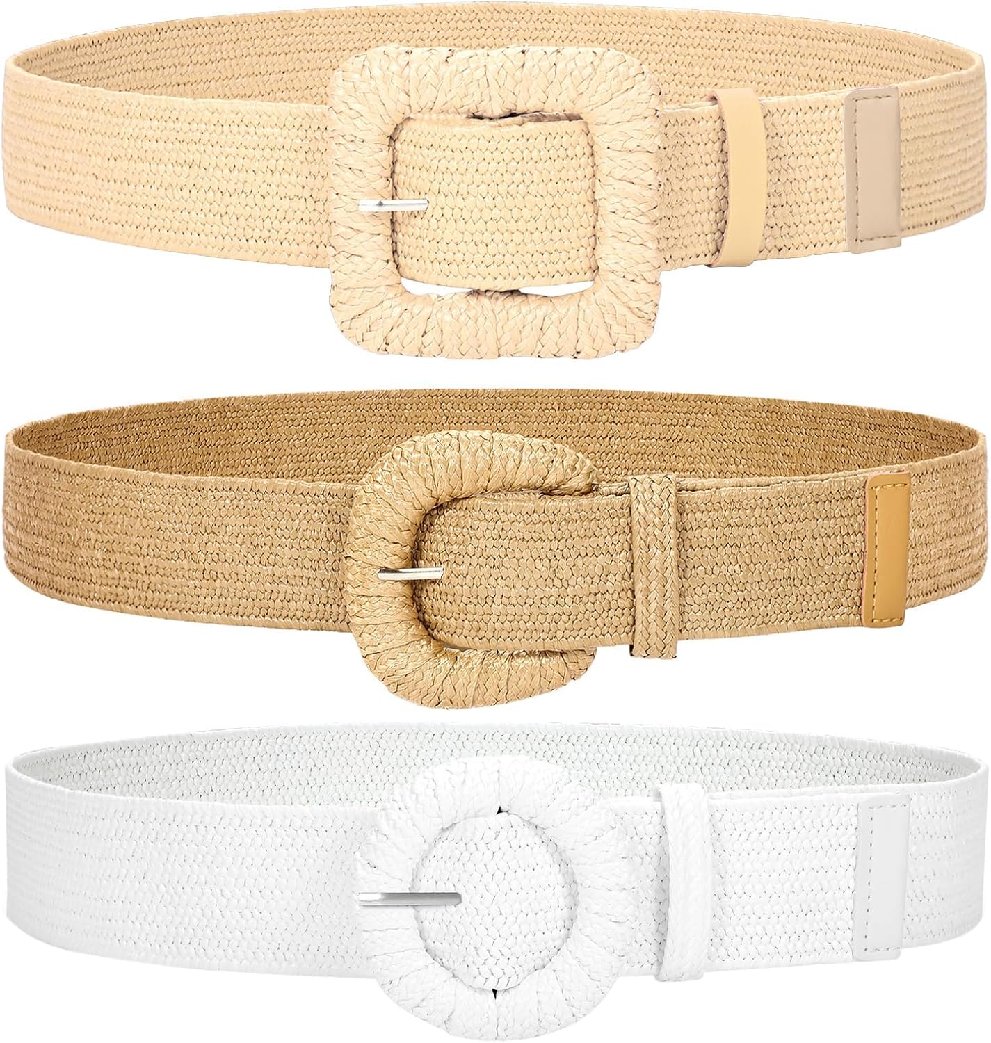 WHIPPY 3 Packs Women Straw Woven Elastic Stretch Waist Belts Fashion Boho Braided Skinny Ladies Dress Belt