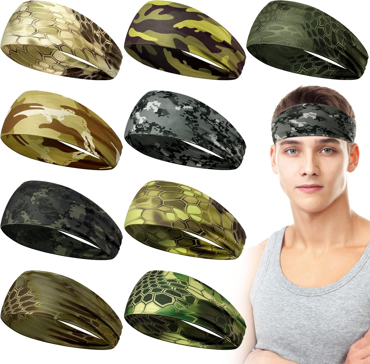 Men's Sweatbands for Workout and Sports - Camo Headband, Sweat Absorbing Wide Headband for Basketball, Football, Cycling, Running, Yoga, 4.7 x 9.8 Inch