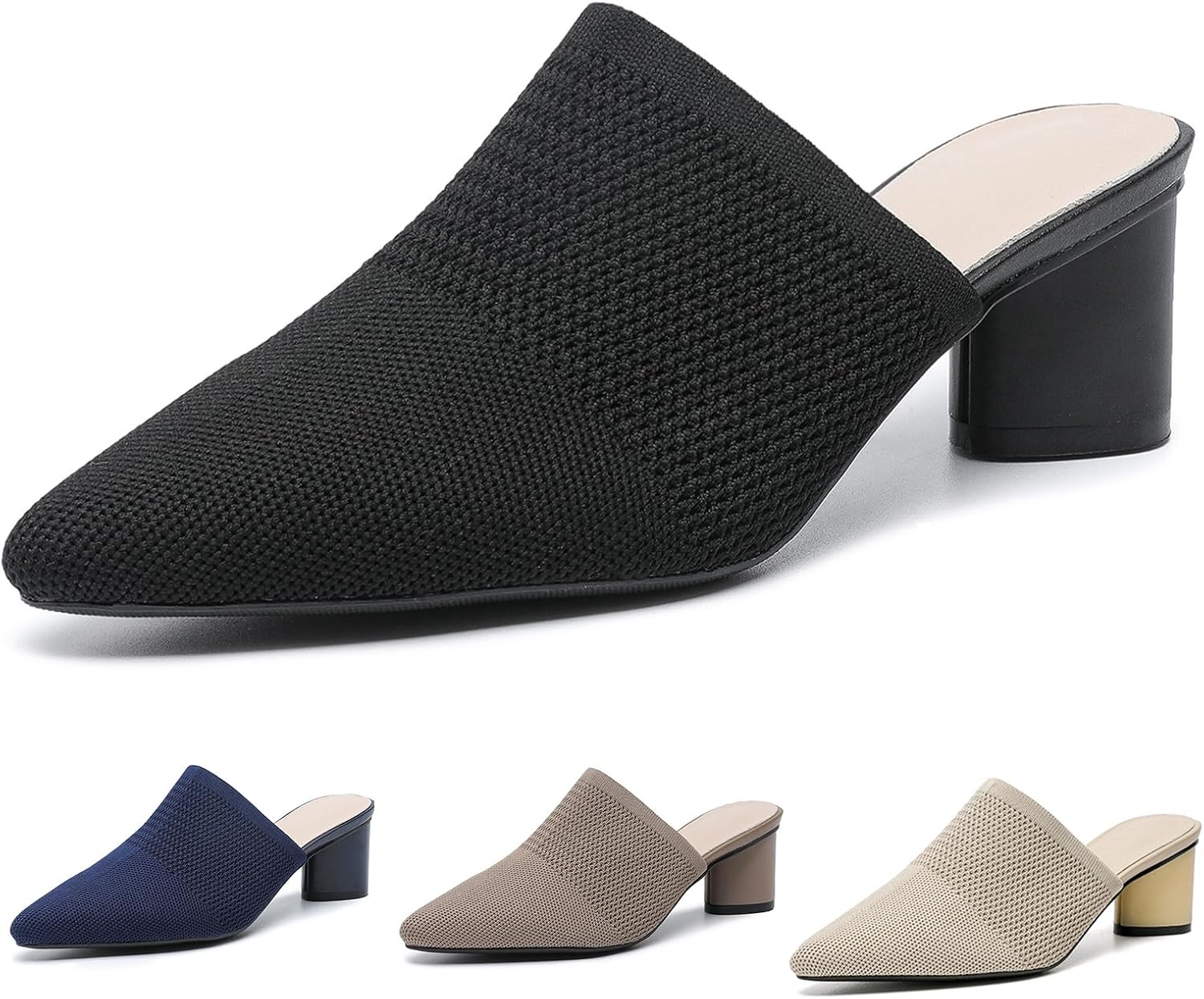 Women’s Knit Mesh Backless Chunky Heel Mules Closed Pointed Toe Slip On Mid Block Heel Dress Pump Sandals Summer Breathable Office Daily Slippers